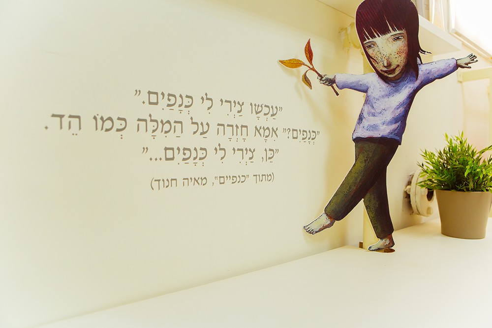 ניסינו ליצור פינות ישיבה שונות: סביב שולחן, ישיבה רכה על פופים, ישיבה על ספסל. "הוצאנו" את הסיפורים החוצה בעזרת האיורים ומשפטים מעניינים מתוך סיפורים.